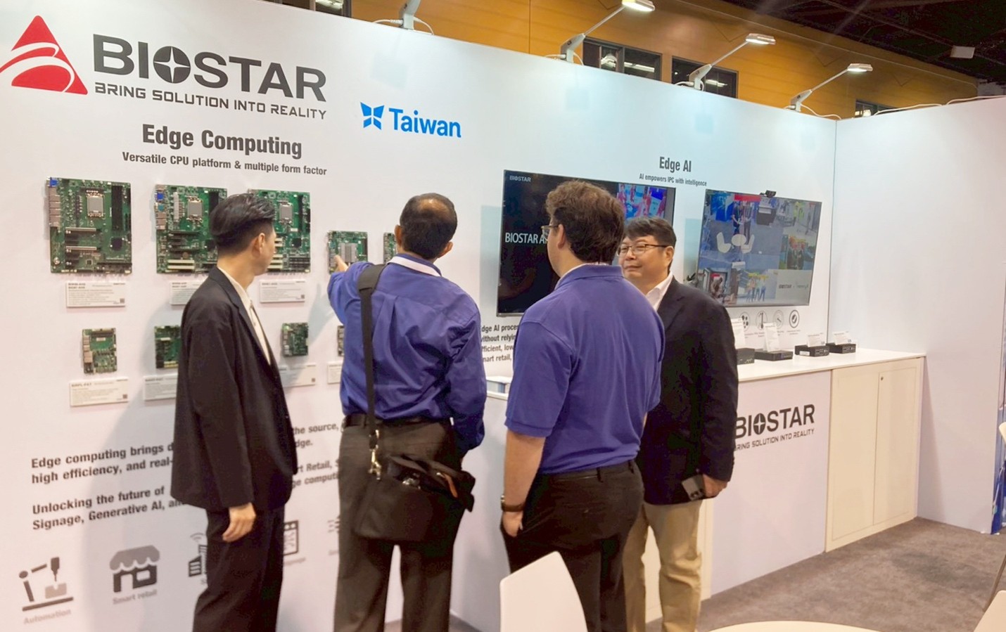 除了 Edge AI 系统外,BIOSTAR 映泰同步展出完整的工业主板与嵌入式平台产品线,应用范畴涵盖智能制造、自动化、智能城市、智能零售及边缘运算等领域。主要型号包括 BIW88-AHS、BIQ87-AHS、BIW68-AHP、BIQ67-AHP、BIH61-AHA,支持 Intel® Core™ Ultra 以及 第 12、13、14 代处理器,搭配 W880、Q870、W680、Q670、H610 芯片组。这些主板具备高速网络、灵活显示输出与强大的 I/O 扩充能力,是高效能工业应用与边缘部署的理想选择。